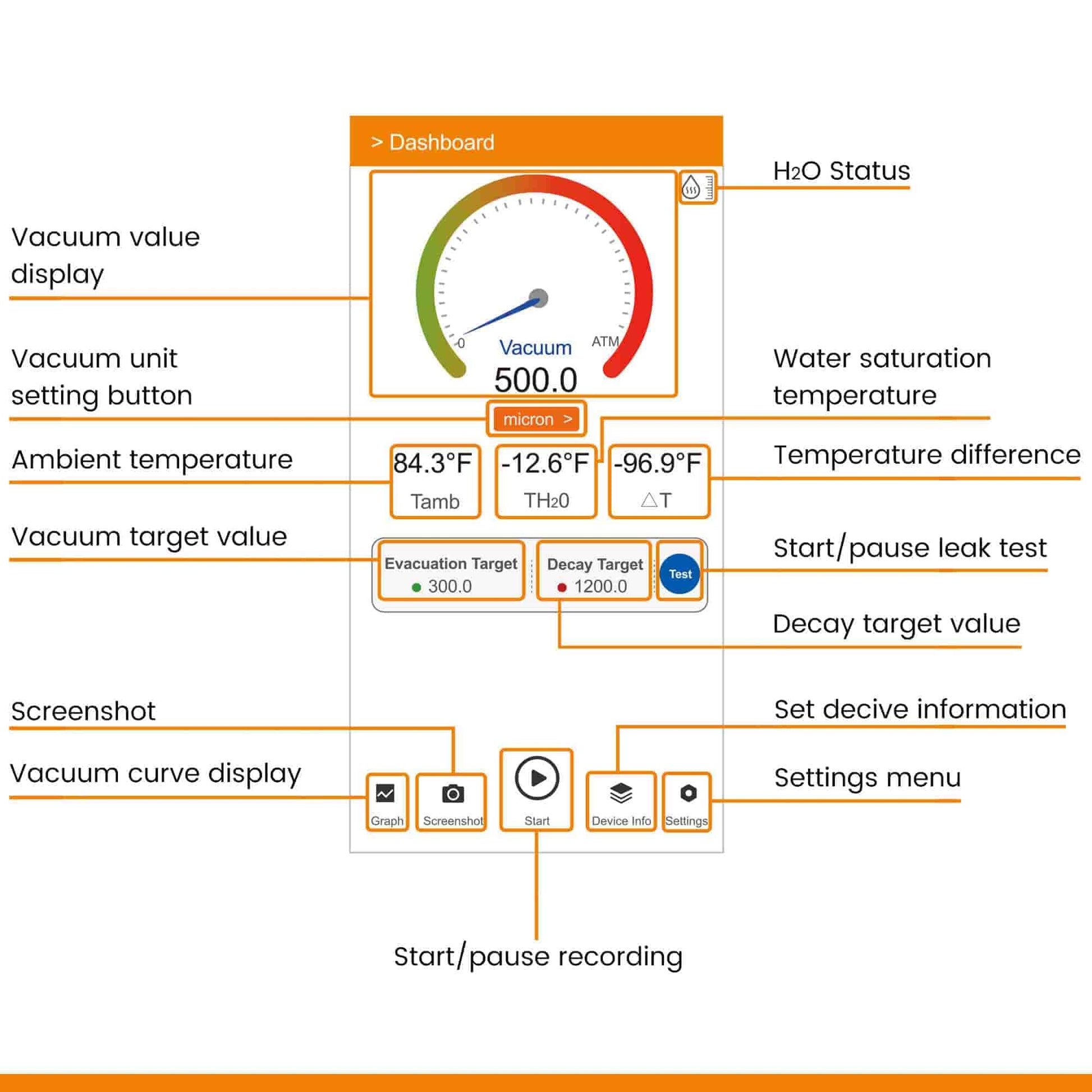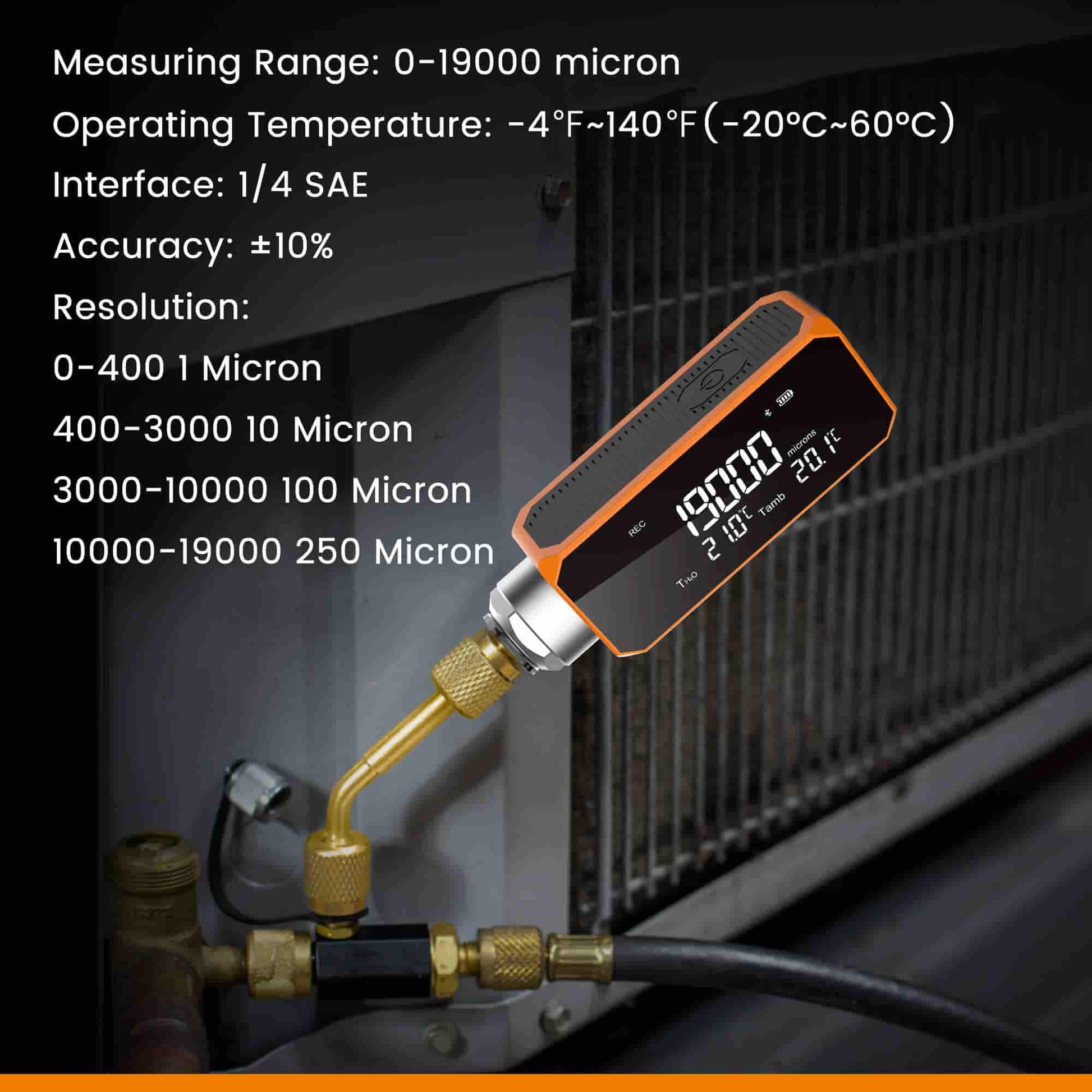 - Elevata precisione: il vacuometro digitale consente di ottenere misurazioni precise del vuoto profondo con risoluzioni a una cifra e fornisce notifiche quando l'obiettivo di evacuazione viene raggiunto.